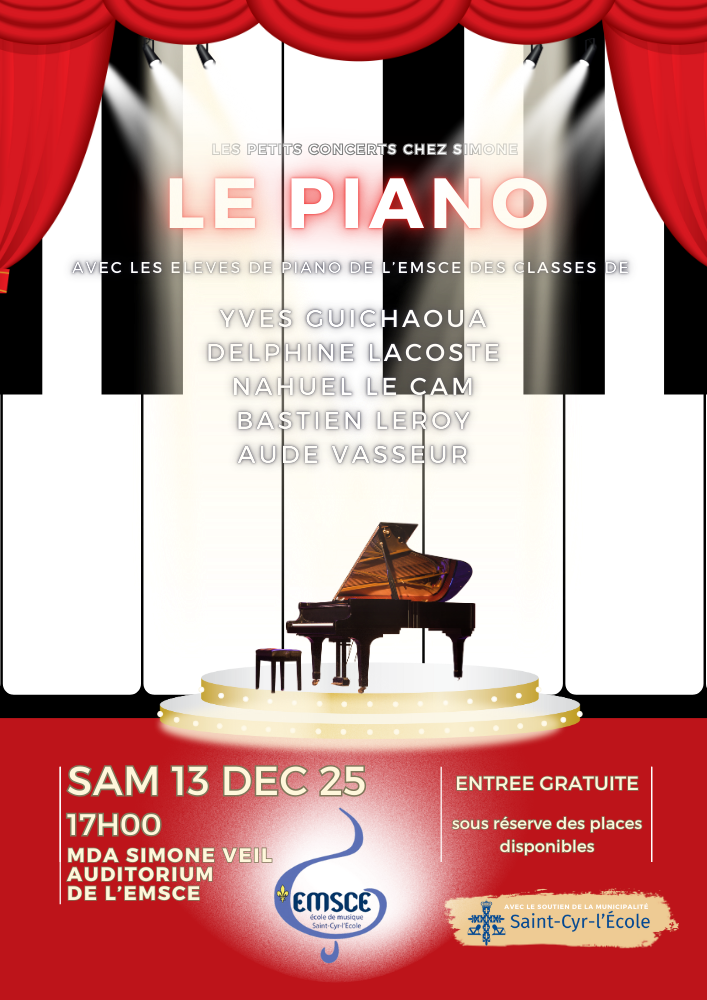 Le Piano Chez Simone est une audition mettant à l’honneur tous les pianistes de l’EMSCE, qu’ils soient débutants ou avancés et quel que soit leur âge. C’est souvent l’occasion pour nos petits débutants de se produire pour la première fois devant un public. N’hésitez pas à venir les encourager.