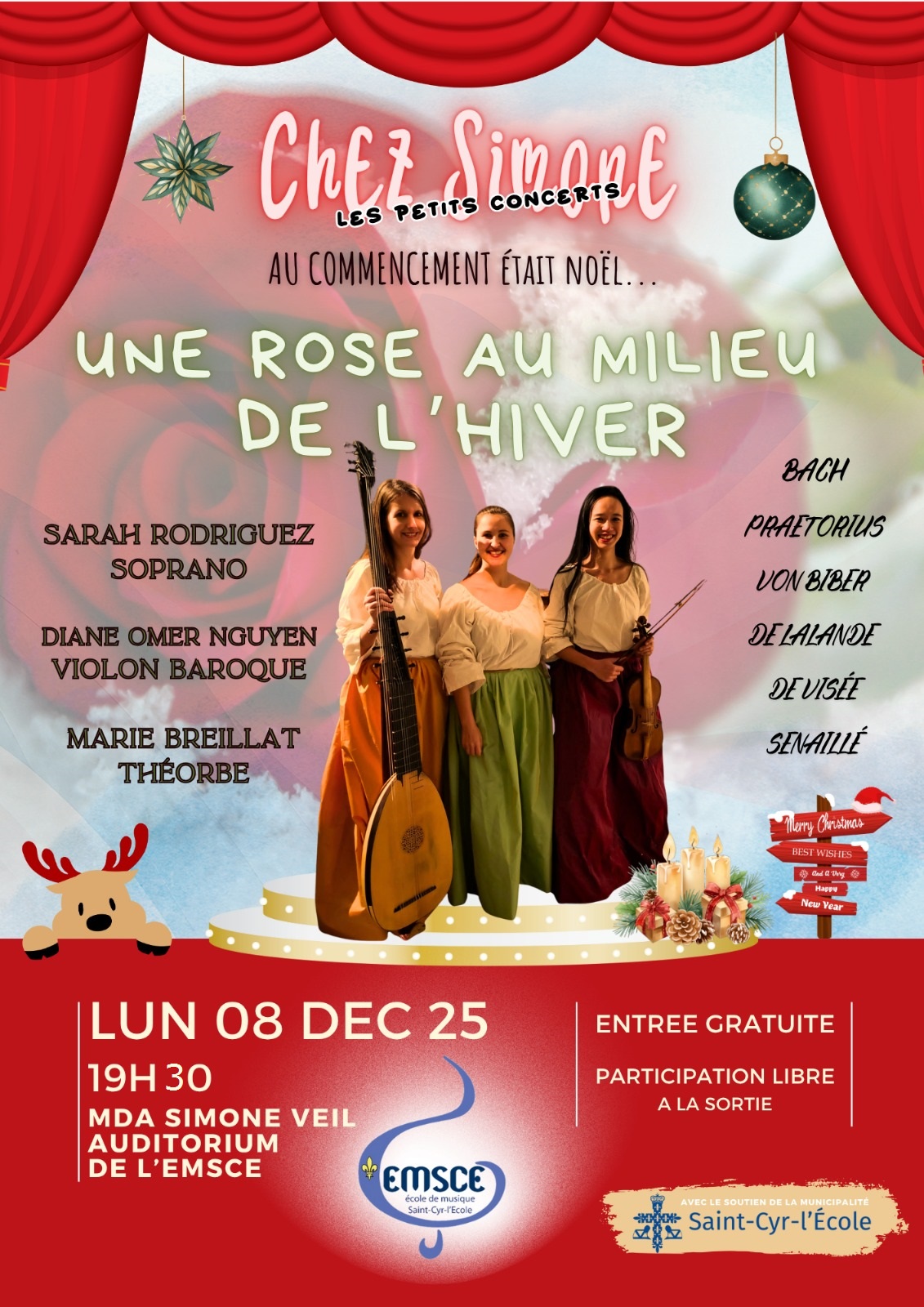 L’EMSCE vous accueille une 9ème fois Chez Simone pour un concert de musique baroque intitulé “Une rose au milieu de l’hiver” où Diane Omer Nguyen, ancienne professeur de FM et de chant à l’EMSCE, sera accompagnée par Sarah Rodriguez et Marie Breillat.